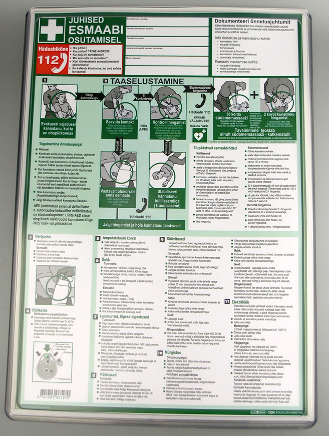 Elustamisplakatid, esmaabi postrid on saadaval kolmes erinevas keeles: eesti, vene ja inglise keeles. Iga keel on eraldi plakatil.