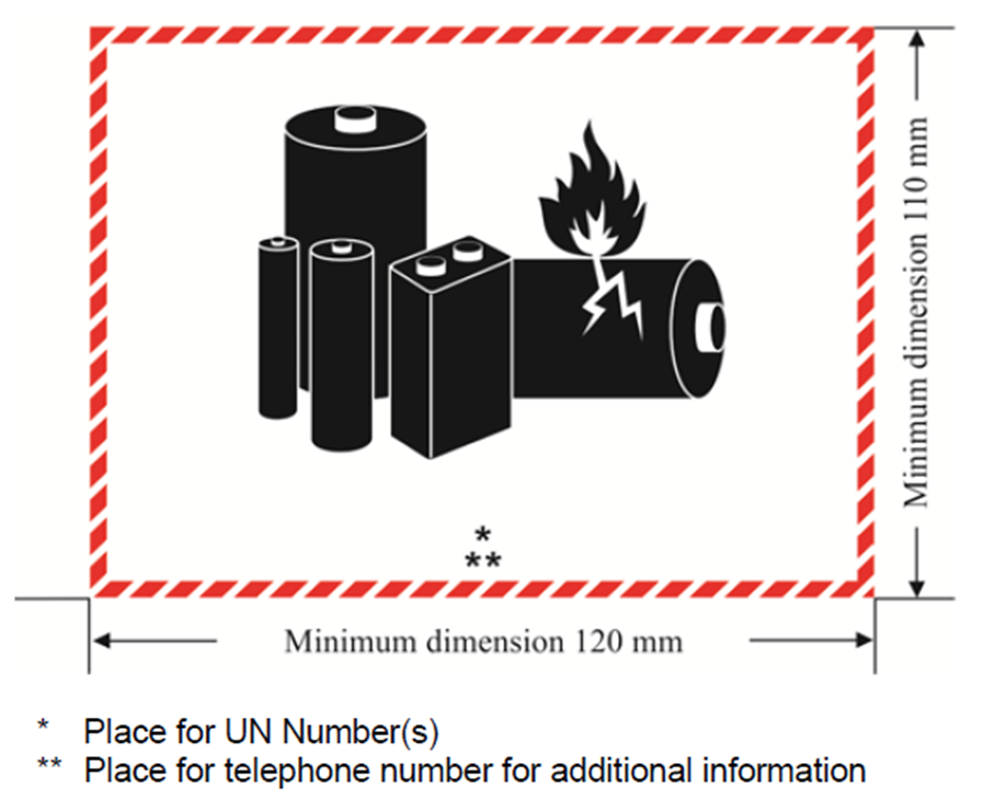 The new handling label must be in the form of a rectangle (120x110mm-minimun). It must have a red, hatched edging (5mm wide). The symbol (a group of batteries, one damaged and emitting flame) must be black and white. This symbol must sit above the UN number for lithium-ion or lithium-metal batteries or cells. If the package size is too small to hold this label then it may be reduced to not less than 105x74mm.